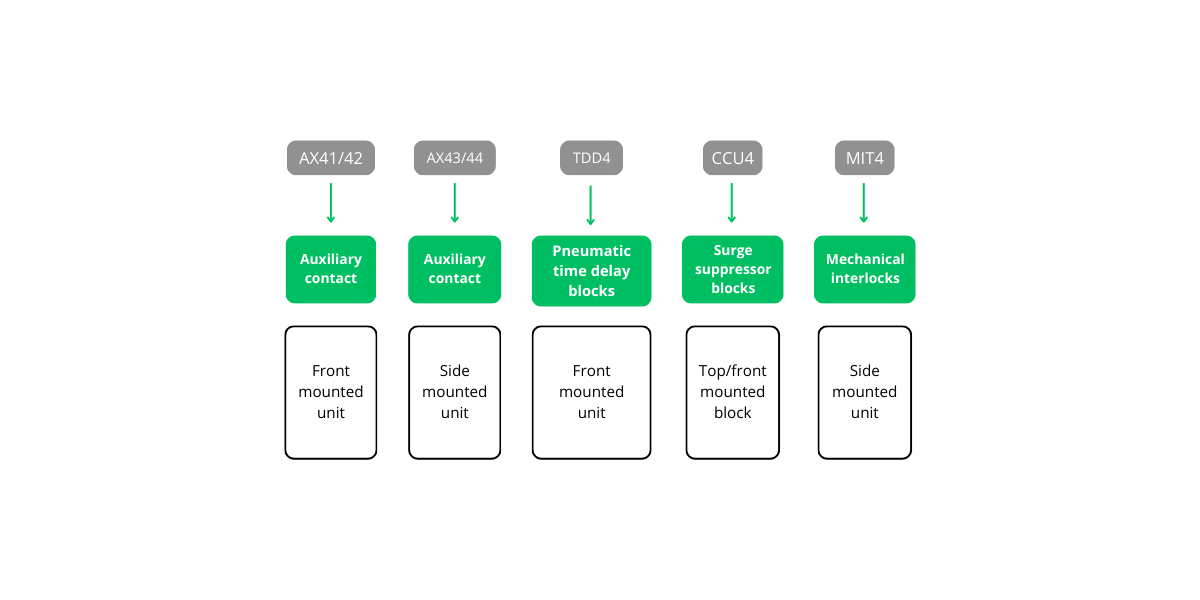Le unità di contatto ausiliario AX41 e i blocchi soppressori di sovratensione CCU41 sono progettati per abbinarsi alla versione miniaturizzata dei contattori Ex9CS, Ex9CSD o Ex9CSR. Le unità di contatto ausiliario sono disponibili con quattro contatti con tutte le possibili combinazioni di contatto. La linea di contattori Ex9C (Ex9C EX9CD Ex9CR) condivide gli accessori, ovvero il portafoglio disponibile può essere utilizzato per tutte le Dimensioni dei contattori (eccetto quelli miniaturizzati). Ogni contattore può essere equipaggiato con una unità a montaggio frontale (AX42 TDD4), due unità di contatto a montaggio laterale AX43/44 (una a sinistra e l’altra a destra) e un blocco soppressore di sovratensione CCU42/43. L’installazione di una unità a montaggio frontale non pregiudica la possibilità di