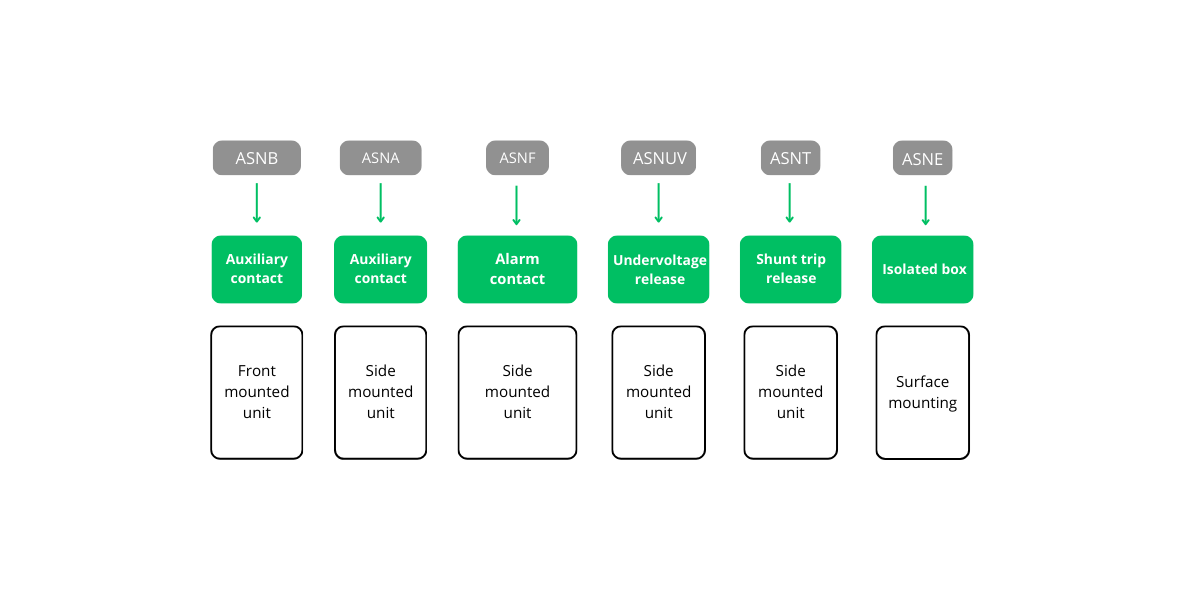 Gli interruttori automatici magnetotermici per protezione motori Ex9SN25B possono essere dotati di vari tipi di accessori aggiuntivi. Tutti gli accessori sono progettati in modo che sia possibile combinare diversi tipi con un unico dispositivo. Possono essere utilizzate fino a tre unità di contatto ausiliario o di allarme più uno sganciatore di tensione. Le unità di contatto ausiliario sono disponibili con tre possibili combinazioni di contatto. Le unità di contatto ausiliario e di allarme sono montate sul lato sinistro del dispositivo. Le unità di sgancio sono montate sul lato destro. L’installazione di un’unità di contatto ausiliario o di allarme non influisce sulla possibilità di installare uno sganciatore di tensione.