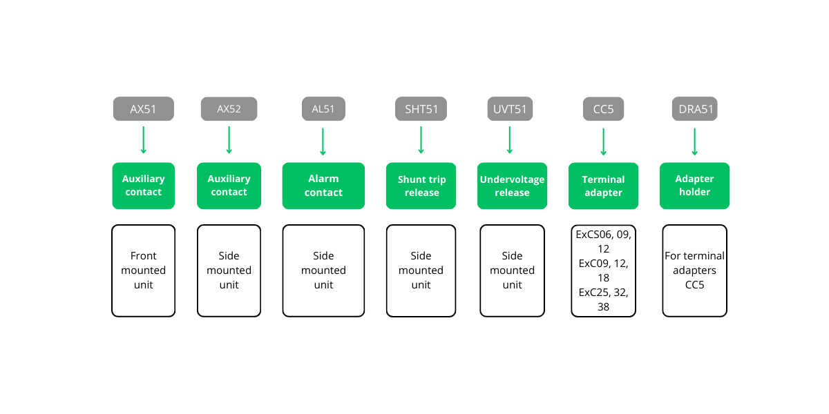 Gli interruttori automatici magnetotermici per protezione motori Ex9S32A e Ex9S80A possono essere dotati di vari tipi di accessori aggiuntivi. Tutti gli accessori sono progettati in modo da rendere possibile la combinazione di diversi tipi con un unico dispositivo. Possono essere utilizzate fino a tre unità di contatto ausiliario o di allarme più uno sganciatore di tensione. Le unità di contatto ausiliario sono disponibili con tre possibili combinazioni di contatto. Le unità di contatto ausiliario e di allarme devono essere montate sul lato sinistro del dispositivo. Le unità di sgancio sono montate sul lato destro. L’installazione di un’unità di contatto ausiliario o di allarme non influisce sulla possibilità di installare uno sganciatore di tensione.