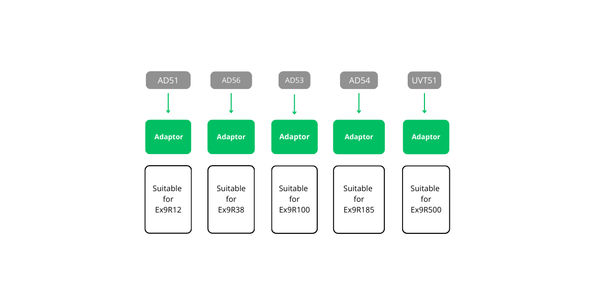 Gli adattatori AD5 sono progettati per consentire l’utilizzo dei relè termici di sovraccarico Ex9R separatamente, senza un contattore della serie Ex9C(S). L’adattatore AD51 è adatto per i relè termici di sovraccarico Ex9R12. Per i relè Ex9R38 è previsto l’adattatore AD56. I relè termici di sovraccarico tipo Ex9R100 possono essere combinati con AD53, la Dimensione R185 con AD54 e il tipo di Dimensione più grande R500 con l’adattatore AD55.